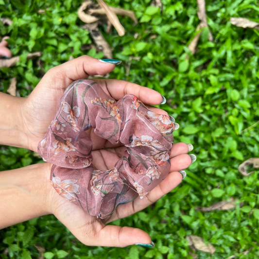 Brown Floral Organza Scrunchie