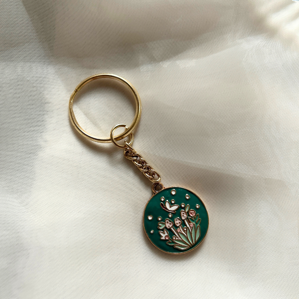 Beautiful metal enamel charm -attached to a keychain.